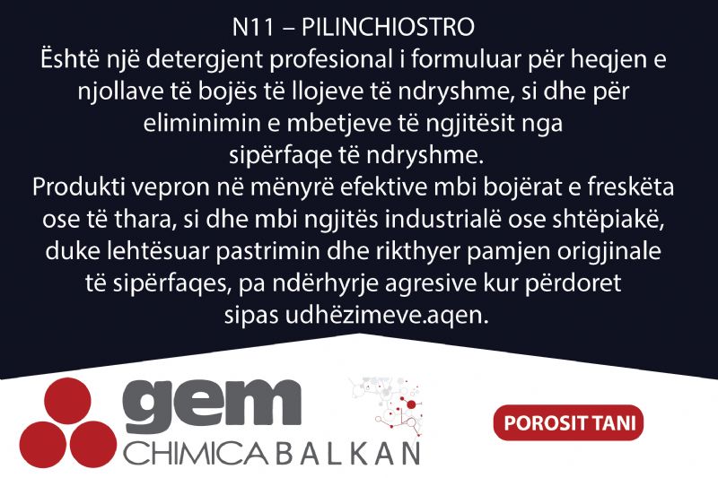 N11 – Pilinchiostro është një detergjent profesional i formuluar për heqjen e njollave të bojës të llojeve të ndryshme, si dhe për eliminimin e mbetjeve të ngjitësit nga sipërfaqe të ndryshme.